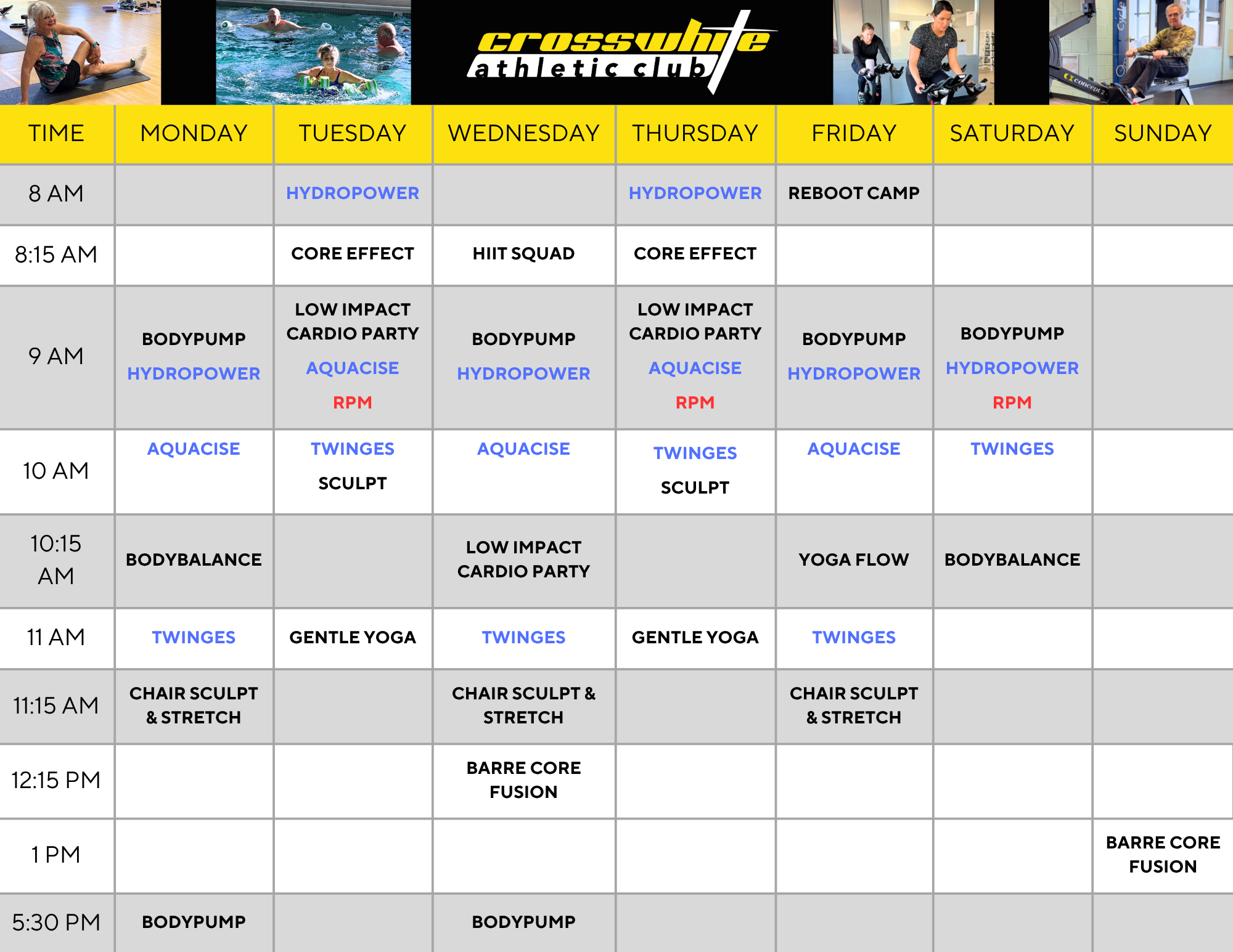 Aqua Classes are in blue, group fitness in black and cycle classes in red. Class descriptions are detailed below.